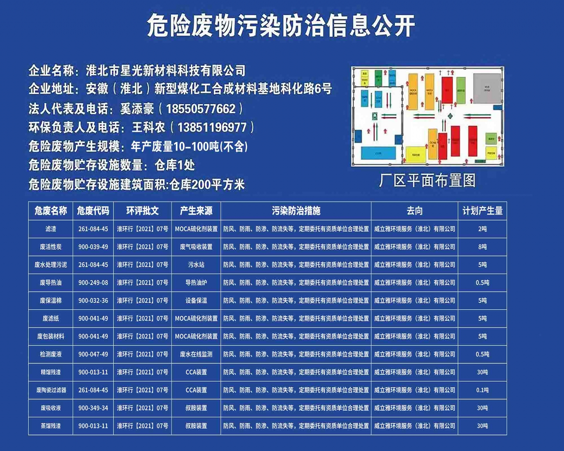 淮北市星光新材料科技有限公司10000t/a聚氨酯橡膠硫化劑MOCA、10000t/a鄰氯苯胺項目(一期)配套建設(shè)的環(huán)境保護設(shè)施調(diào)試時間延期公示根據(jù)關(guān)于發(fā)布《建設(shè)項目竣工環(huán)境保護驗收暫行辦法》的公告(國環(huán)規(guī)評[2017]4號)的要求,我公司10000t/a聚氨酯橡膠硫化劑MOCA、10000t/a鄰氯苯胺項目(一期)配套建設(shè)的環(huán)境保護設(shè)施調(diào)試起止日期為2022年2月19日——2022年5月18日。